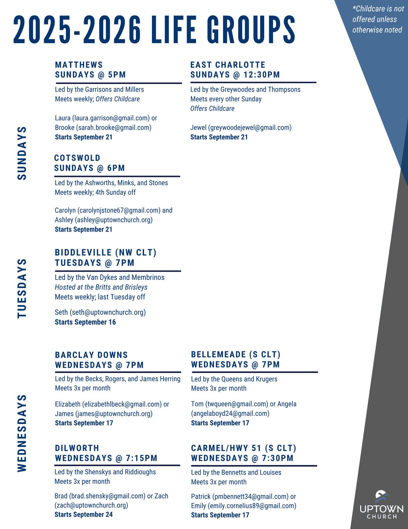 Groups meet around the Charlotte area on various nights of the week, September through May, some weekly and others 2-3 times a month. Life Groups are open to anyone from any life stage and are not limited in size.
